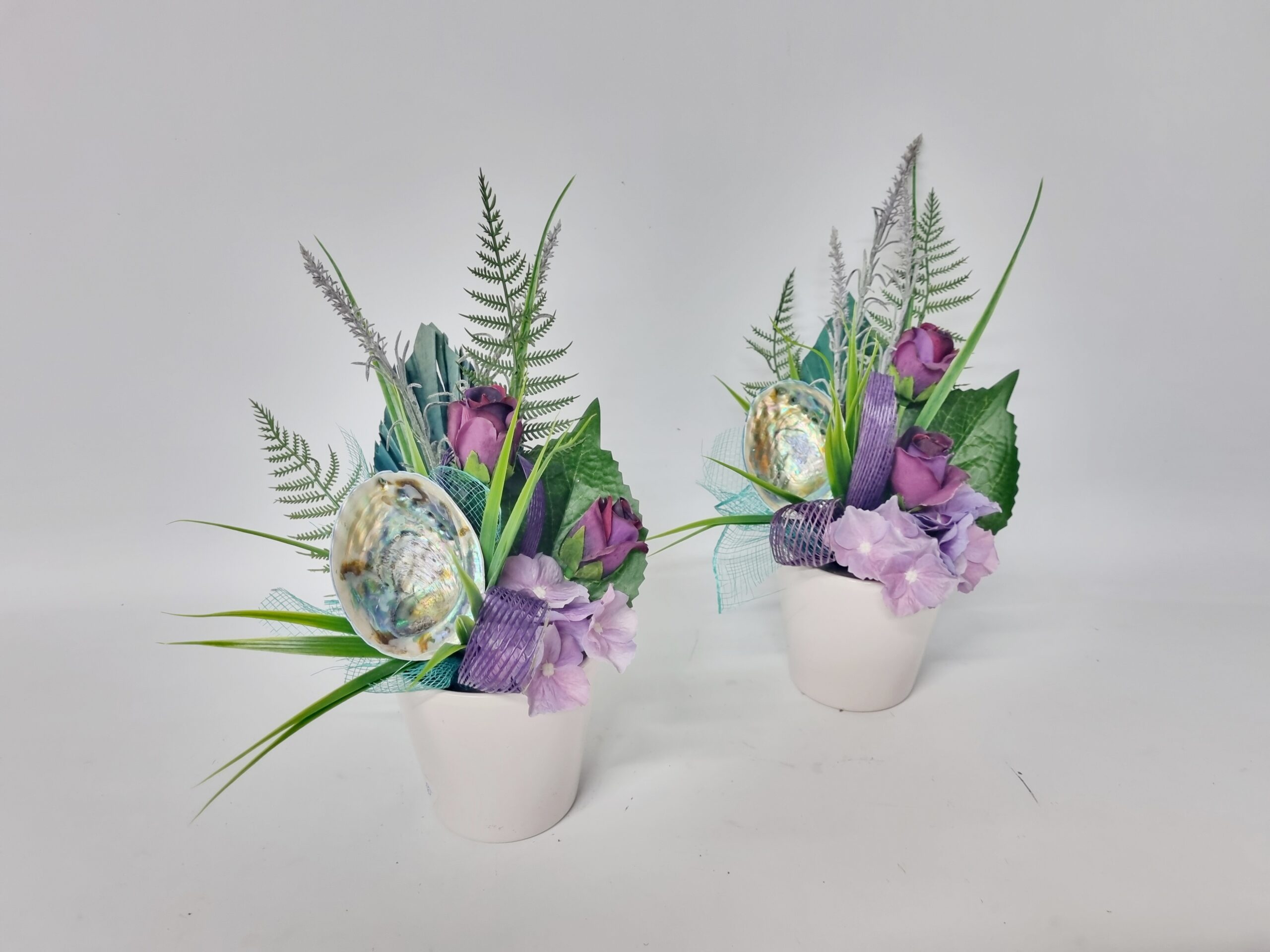 A keepsake arrangement in purple & paua tones arranged with a mix of silk and dried materials and lush silk foliage in a crisp white pot with a focal paua shell. This is a great lasting gift that just keeps on giving. It just requires a little dusting.